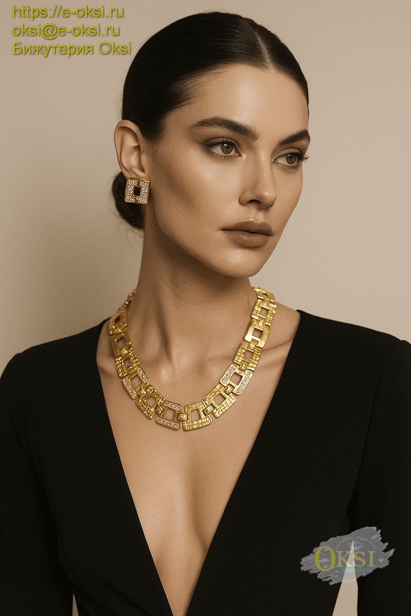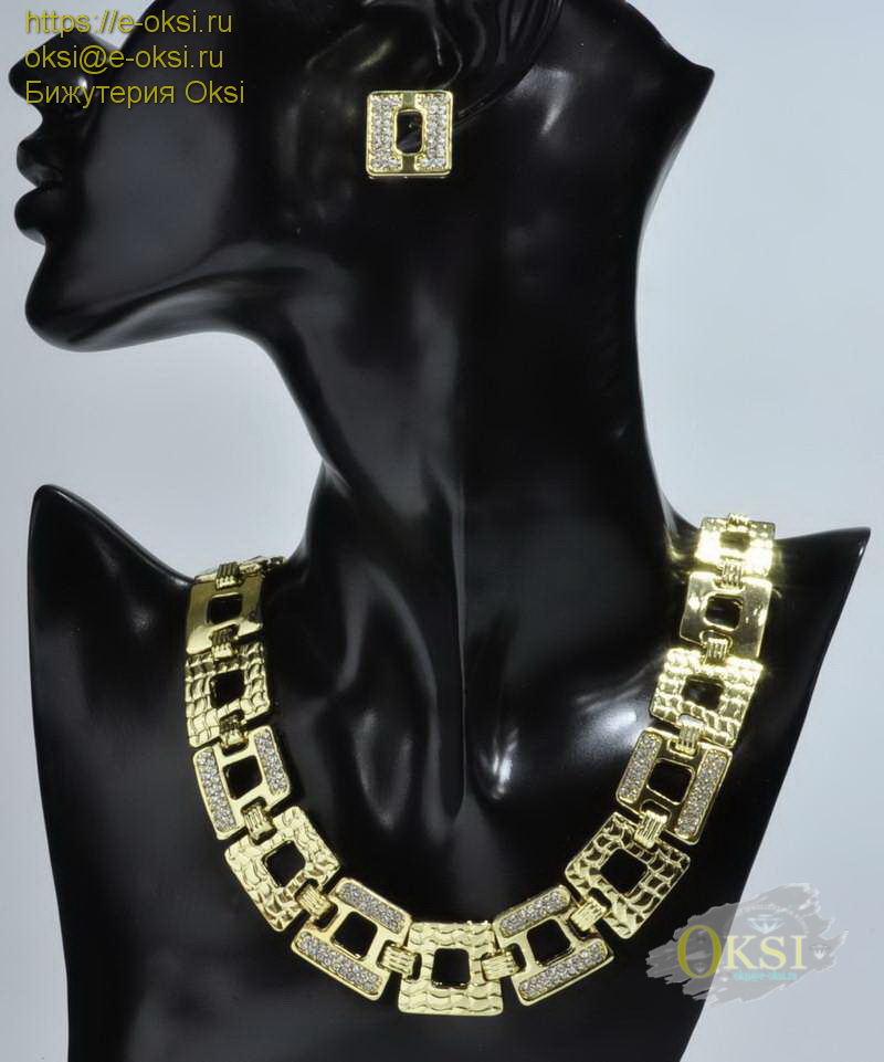 Стильный комплект инкрустирован сверкающими кристаллами. К комплекту идеально подходит браслет 30061312. Качественное гальваническое покрытие золотого цвета. Длина колье 47 см. Серьги длиной 2 см.