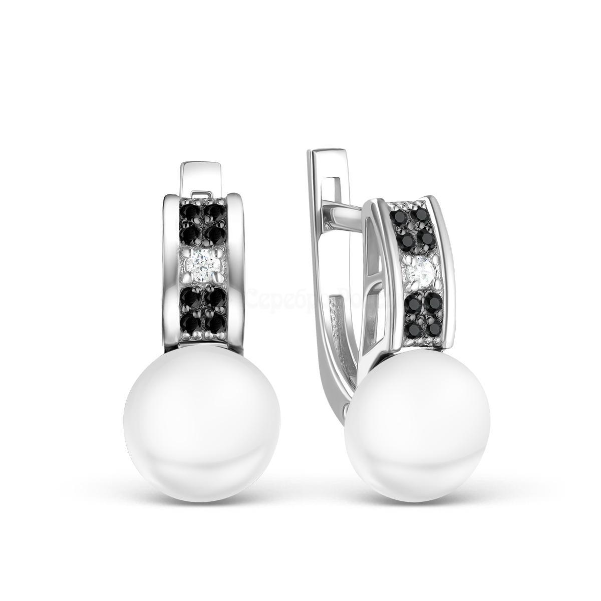 Серьги из серебра с культ. жемчугом и фианитами родированные 925 пробы С1596р1005216