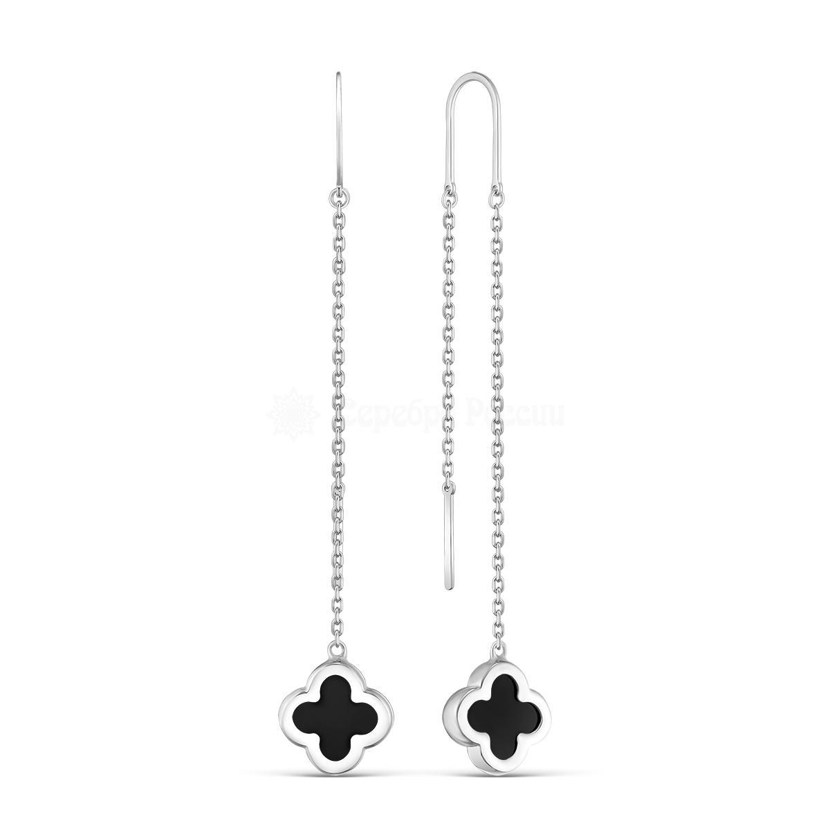 Серьги-продёвки длинные в форме клевер из серебра с камнем оникс родирование 925 пробы 421-10-923р