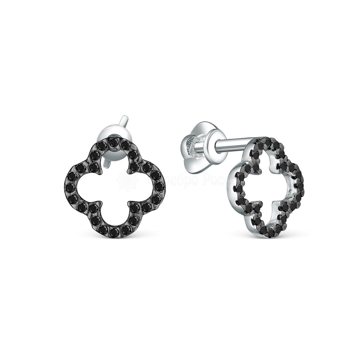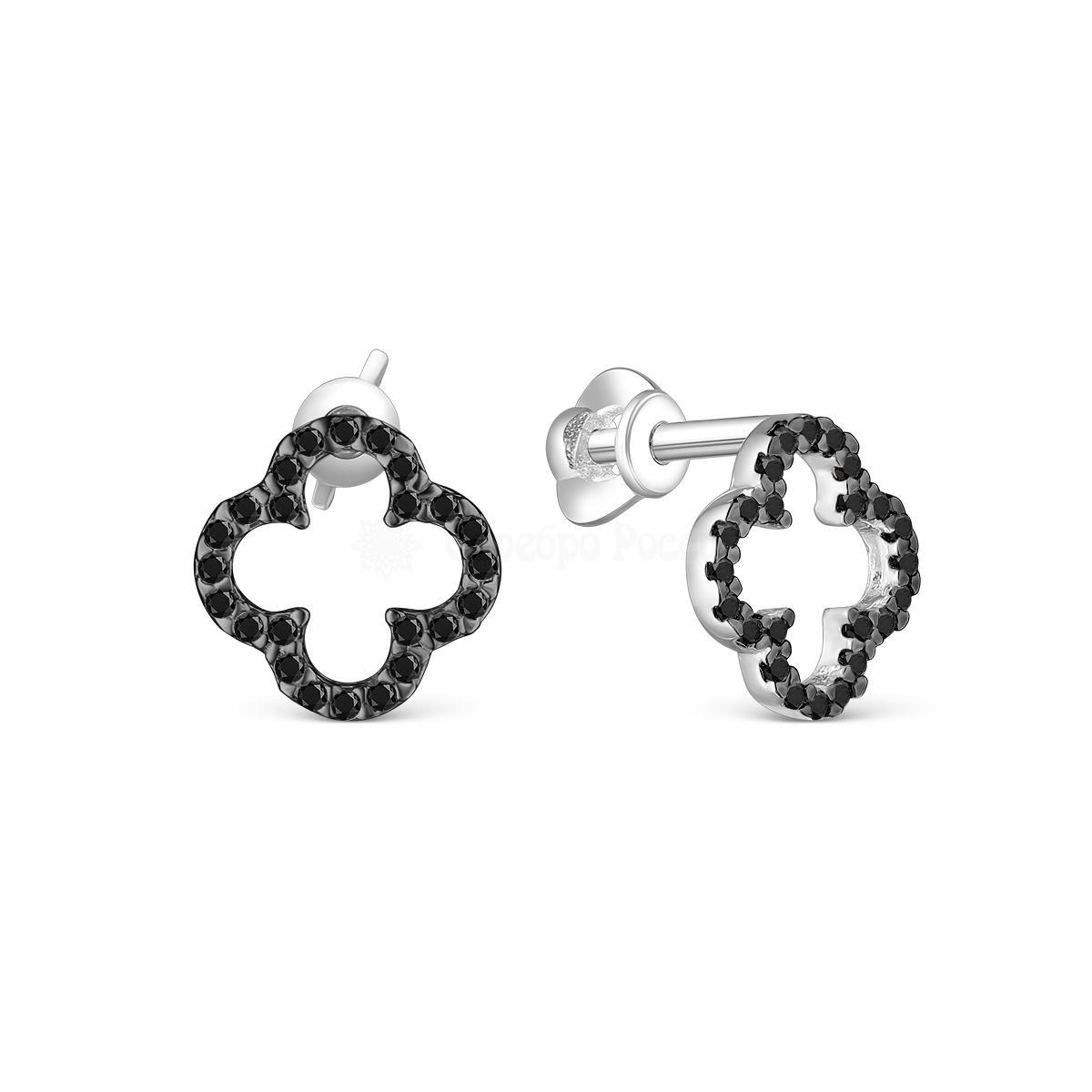 Серьги-пусеты из серебра с натуральной чёрной шпинелью родированные - Клевер 925 пробы С-7351чр416