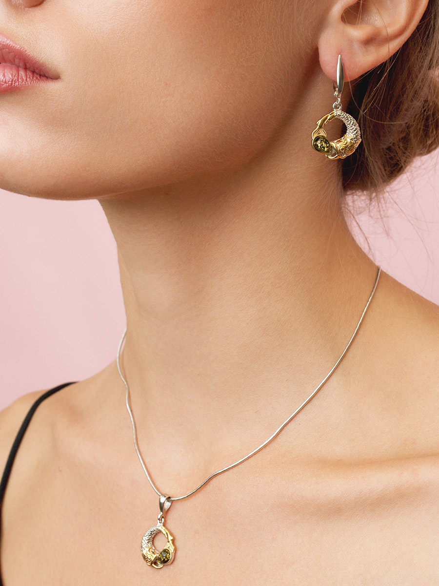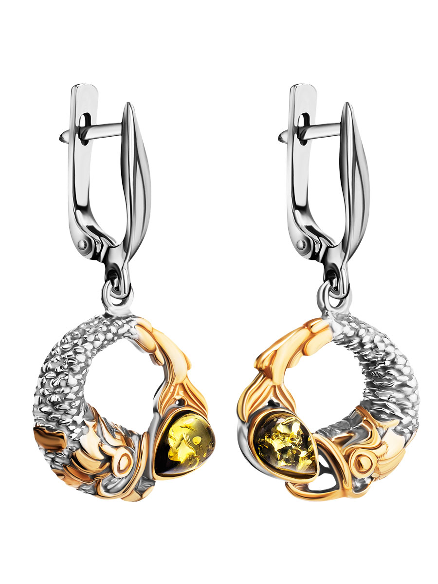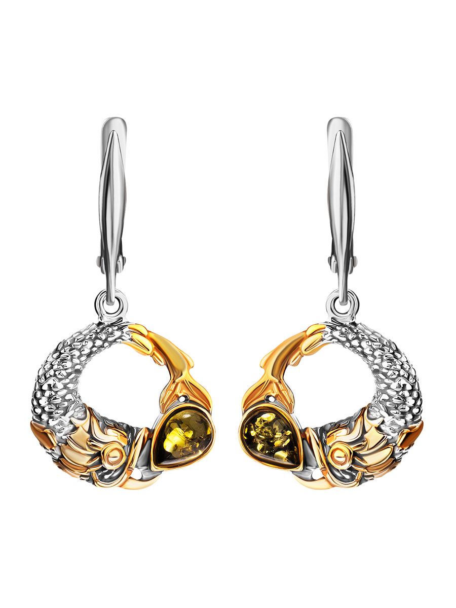 Замечательные серьги с позолотой и зелёным янтарём «Рыбка Кои»