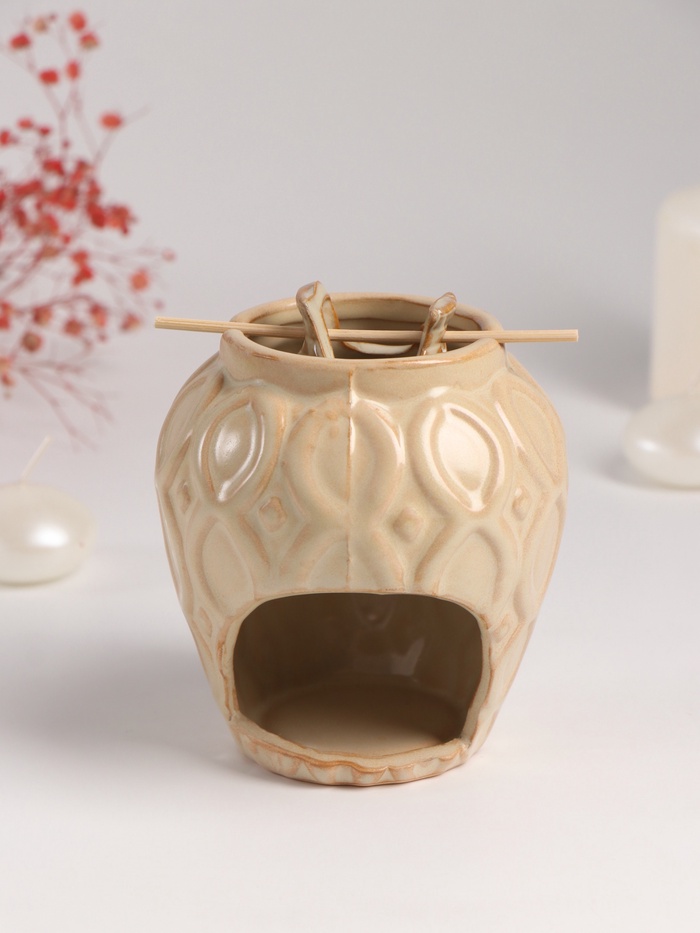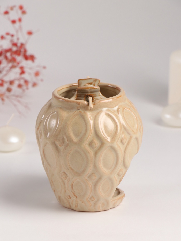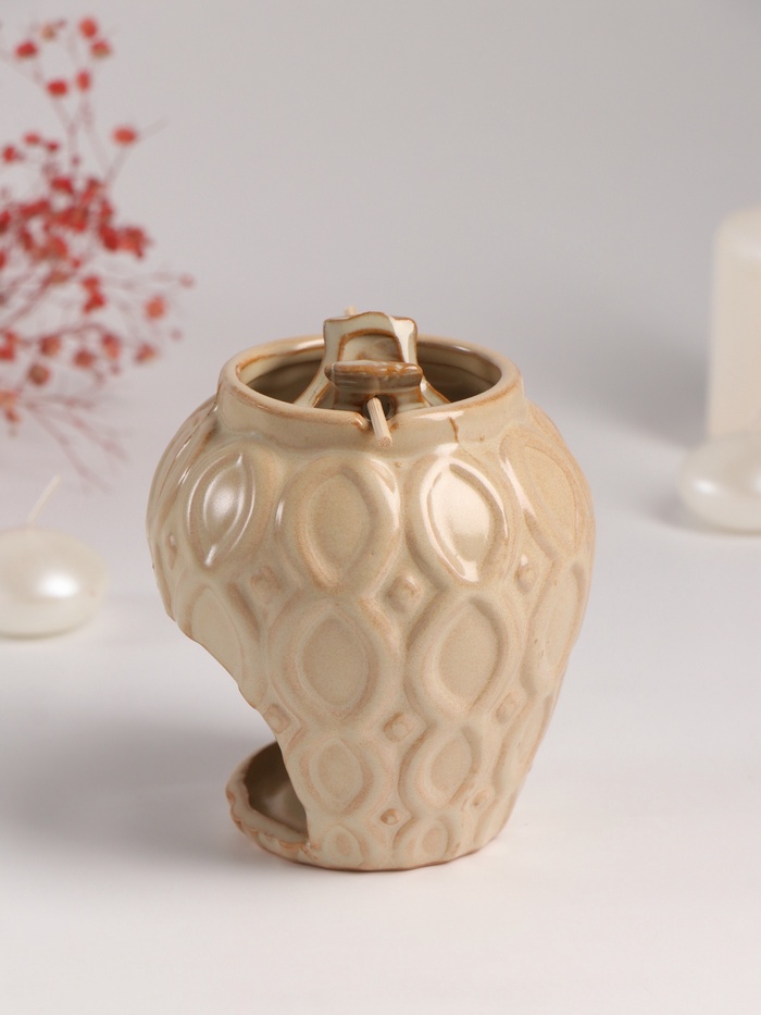 Представляем аромалампу, которая станет изящным дополнением вашего интерьера и источником уюта в доме. Её дизайн вдохновлён классической формой кувшина с тонкими узорами, что создаёт ощущение тепла и естественной красоты. Выполненная из высококачественной керамики в нежном бежевом цвете, она гармонично впишется в любой стиль — от минимализма до этнического.