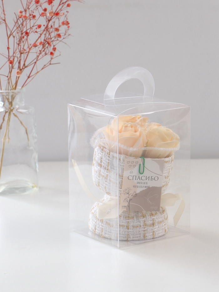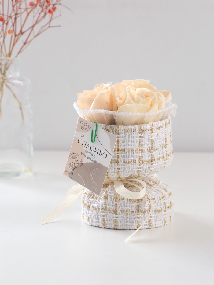 Такой букет станет украшением ванной комнаты, наполняя её лёгким ароматом. Когда захочется побаловать себя, просто отделите один лепесток — он вспенится в руках, даря коже мягкость. Это элегантная альтернатива обычному мылу и цветам: красота, которая не вянет, а приносит пользу с первого дня.