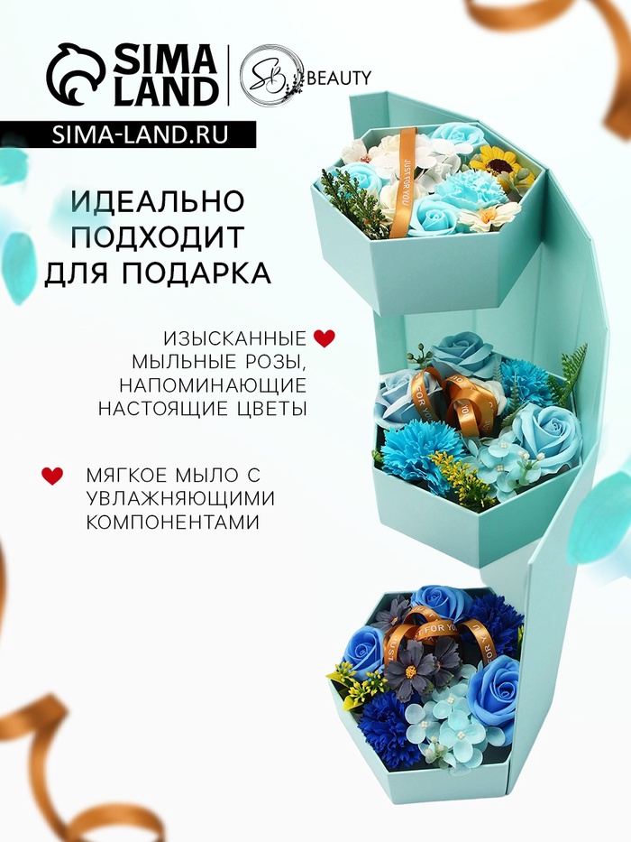 Трехуровневая композиция из мыльных цветов станет поистине уникальным и запоминающимся подарком как на День святого Валентина (14 февраля), так и на Международный женский день (8 Марта).