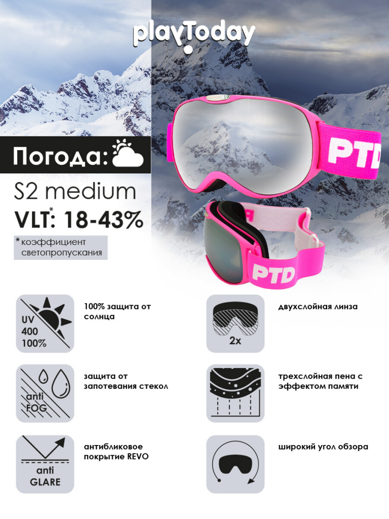 Сферическая двойная линза категории 2 (S2 medium) для улучшенного панорамного обзора и максимальной контрастности. Покрытие anti-fog для предотвращения запотевания стекол. Три слоя пенного уплотнителя для комфортного прилегания к лицу. Коэффициент пропускания света 18-43%. 100% защита от ультрафиолета. Регулируемый ремешок с противоскользящим силиконовым покрытием. Ширина - 4 см. Совместимость со всеми видами шлемов. Размер: 16,5х8,5х20,8х3,1х7.В комплекте чехол из микрофибры.