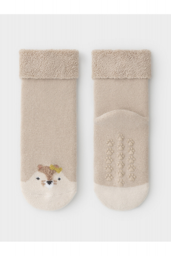 Носки махровые с формованной пяткой и отворотом по краю. На подошве резиновые стопперы. Украшены рисунком. Изделие сохраняет форму и стойкий цвет после многочисленных стирок.