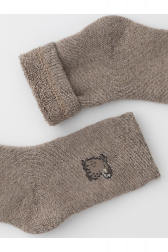 Носки махровые с формованной пяткой и отворотом по краю. На подошве резиновые стопперы. Украшены рисунком. Изделие сохраняет форму и стойкий цвет после многочисленных стирок.