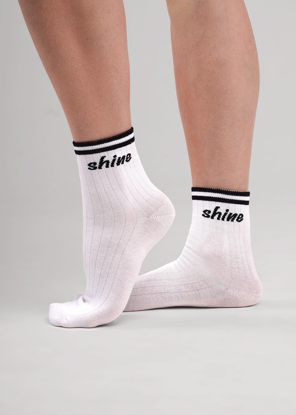 Носки для девочки с контрастными полосами на паголенке и надписью.