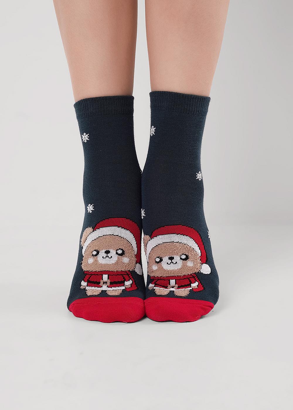 Носки детские с выделенным мысо и пяткой, с рисунком медведя в новогоднем костюме, тело медведя выполнено из пряжи травка