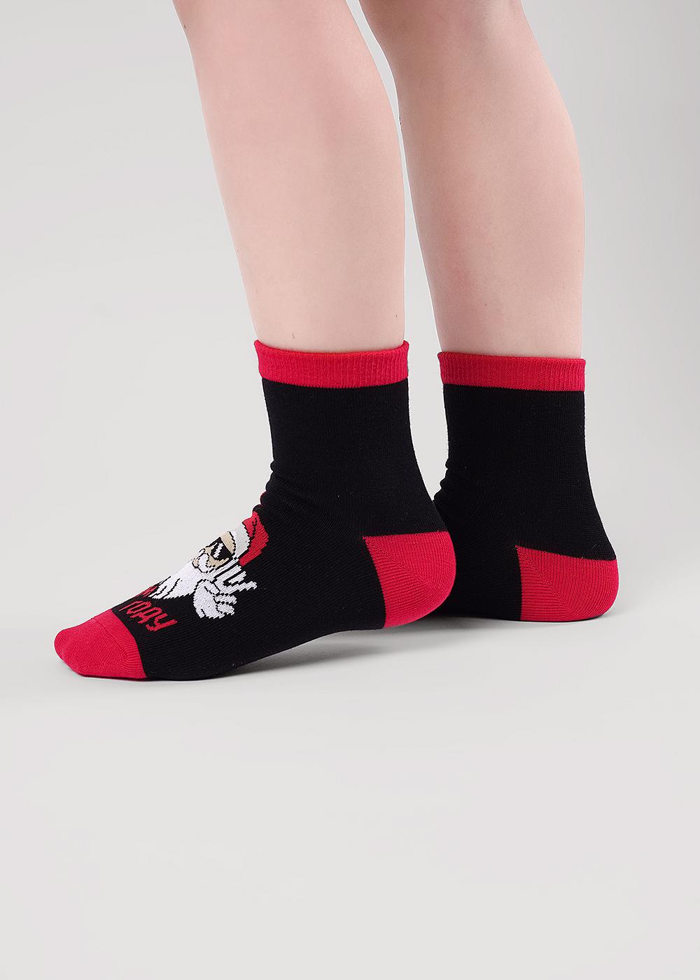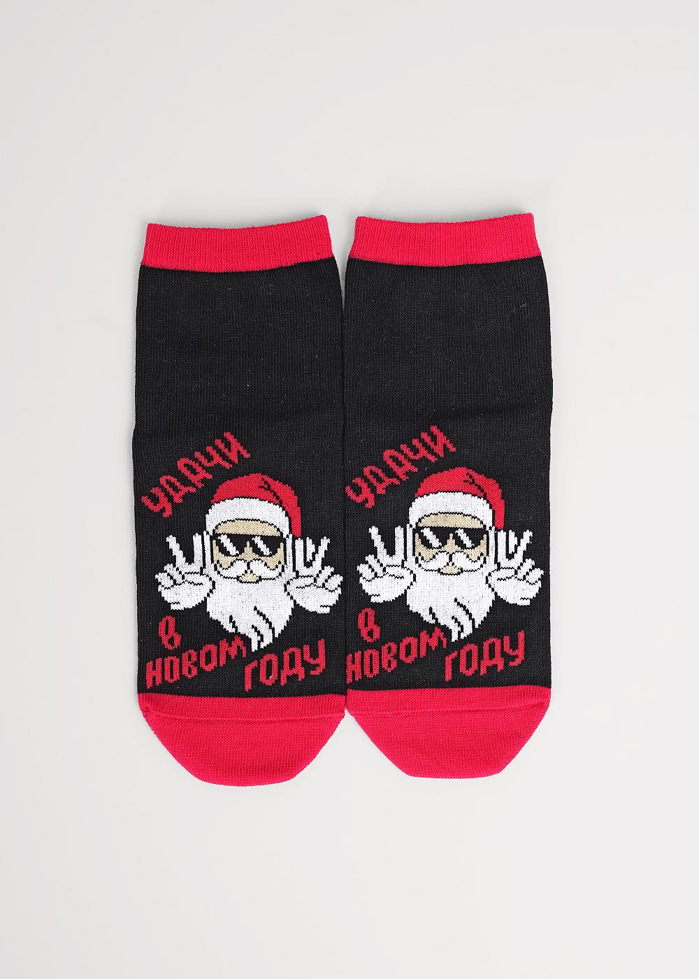 детские носки с выделенным мыском, пяткой и бортом, с рисунком лицо деда мороза и надписью удачи в новом году