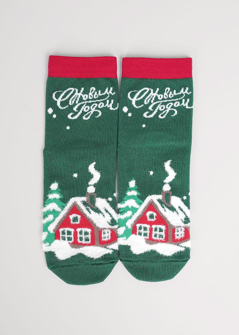 Носки детские с рисунком дом в зимнем лесу, снег выполнен из пряжи травка, и надписью С Новым годом!