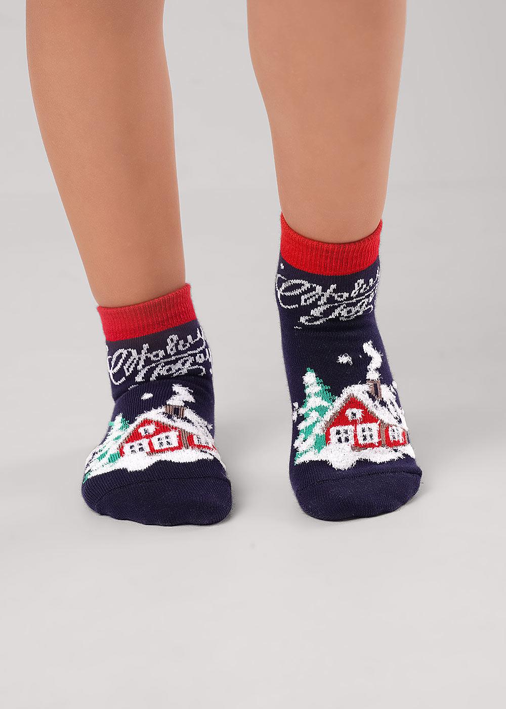 Носки детские с рисунком дом в зимнем лесу, снег выполнен из пряжи травка, и надписью С Новым годом!