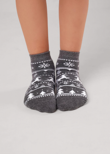 Носки детские с рисунком дом в зимнем лесу, снег выполнен из пряжи травка, и надписью С Новым годом!