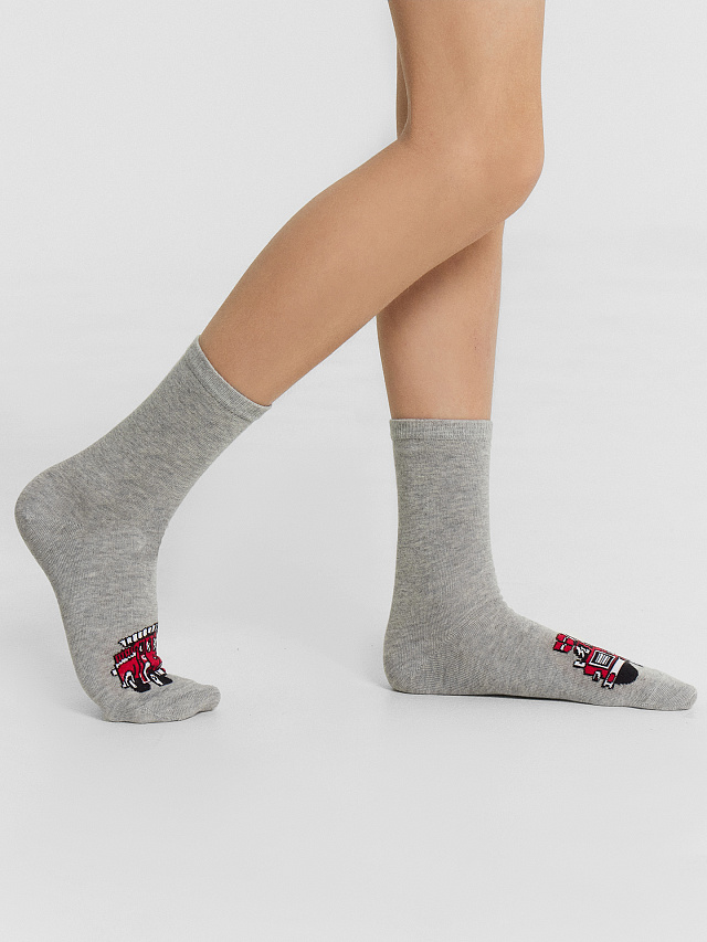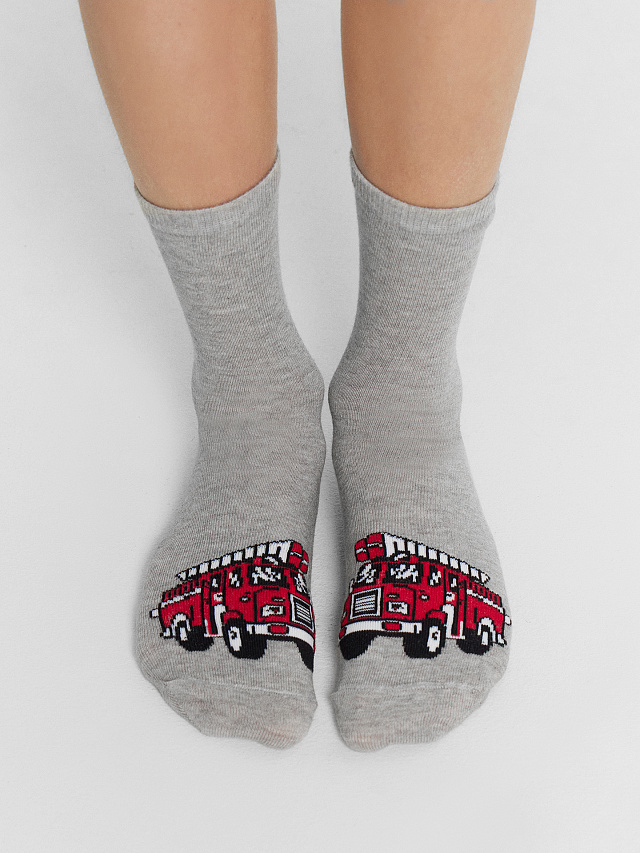 Носки детские серые с рисунком пожарной машины