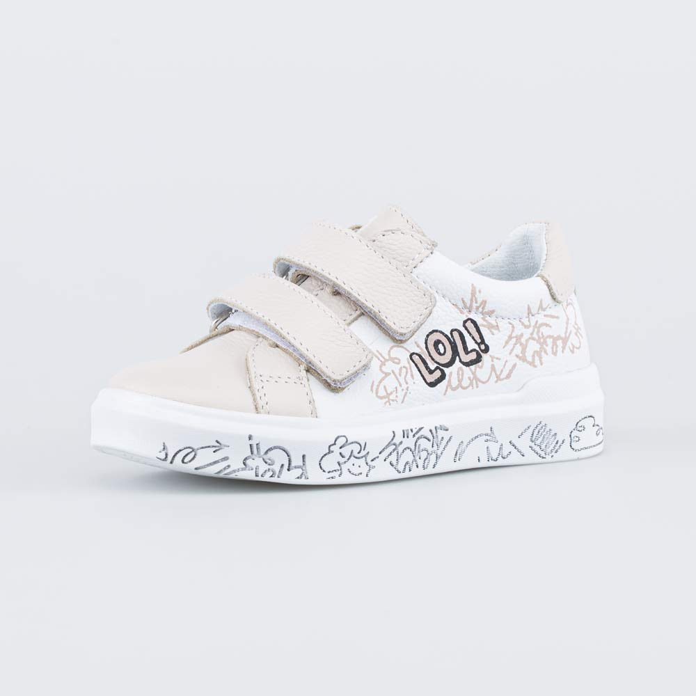 Модель выполнена в сочетании белого и бежевого цветов и украшена принтом, придающим ей настроение современности.