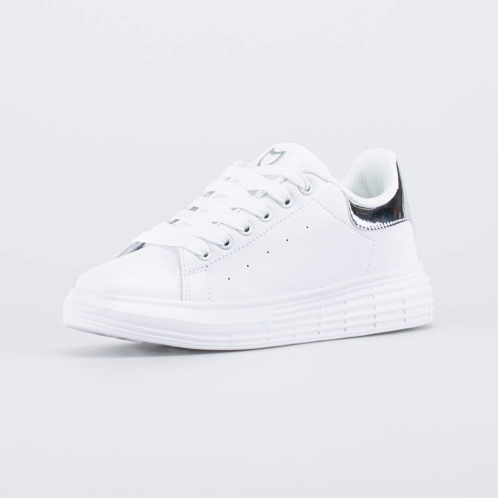 Верх выполнен из дышащей натуральной кожи белого цвета. Дополнительную вентиляцию создает перфорация. Внимание привлекает ненавязчивый элемент из металлизированного материала, расположенный в районе манжета.