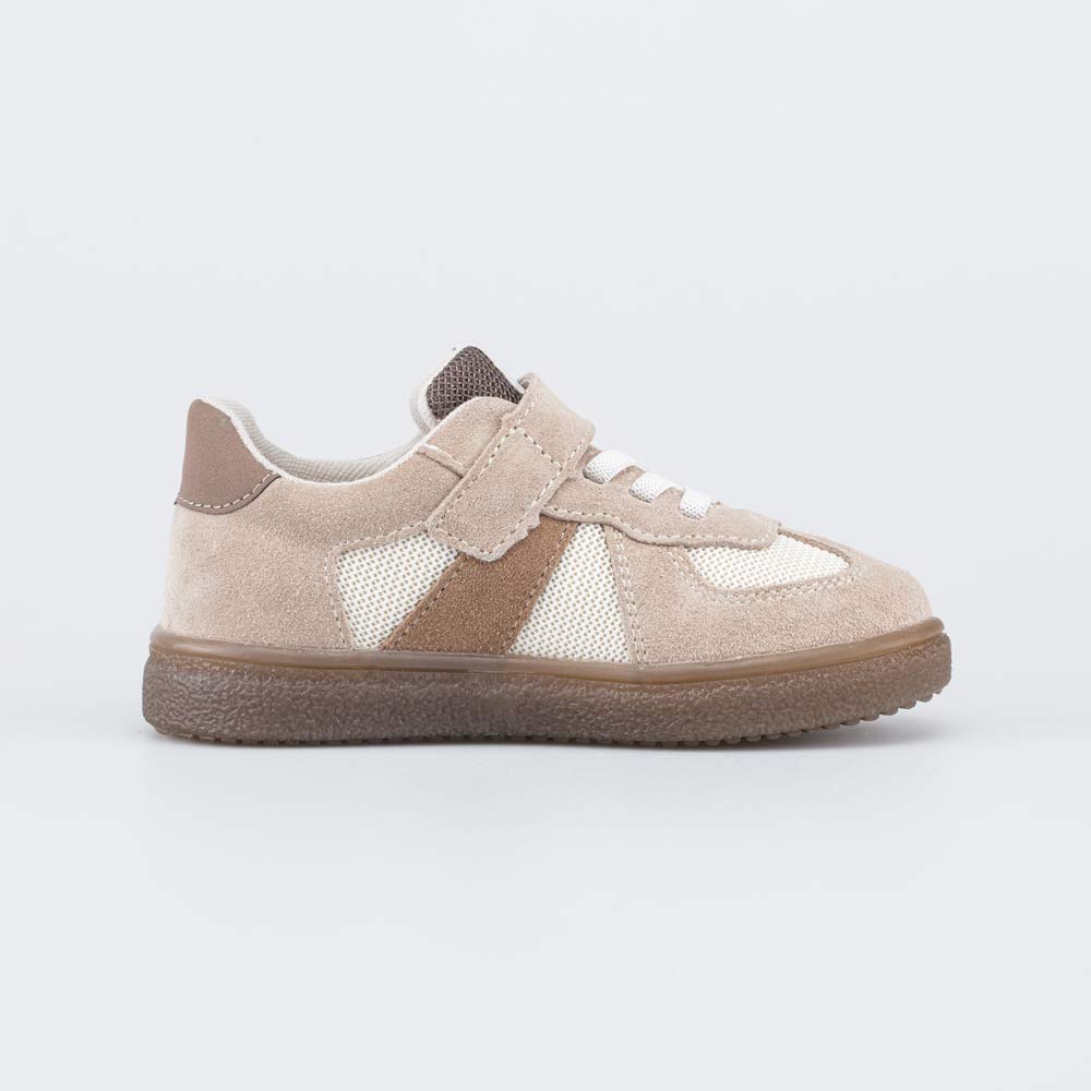 Эти бежевые кеды имеют верх из сочетания гипоаллергенной и дышащей натуральной кожи-велюра и плотного сетчатого материала, который повышает воздухопроницаемость детской обуви и обеспечивает комфорт для ножек даже при длительной носке.