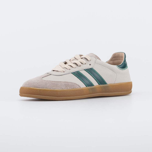Кожаные кеды-полуботинки выполнены в бежевом цвете с сочным акцентом зеленого.