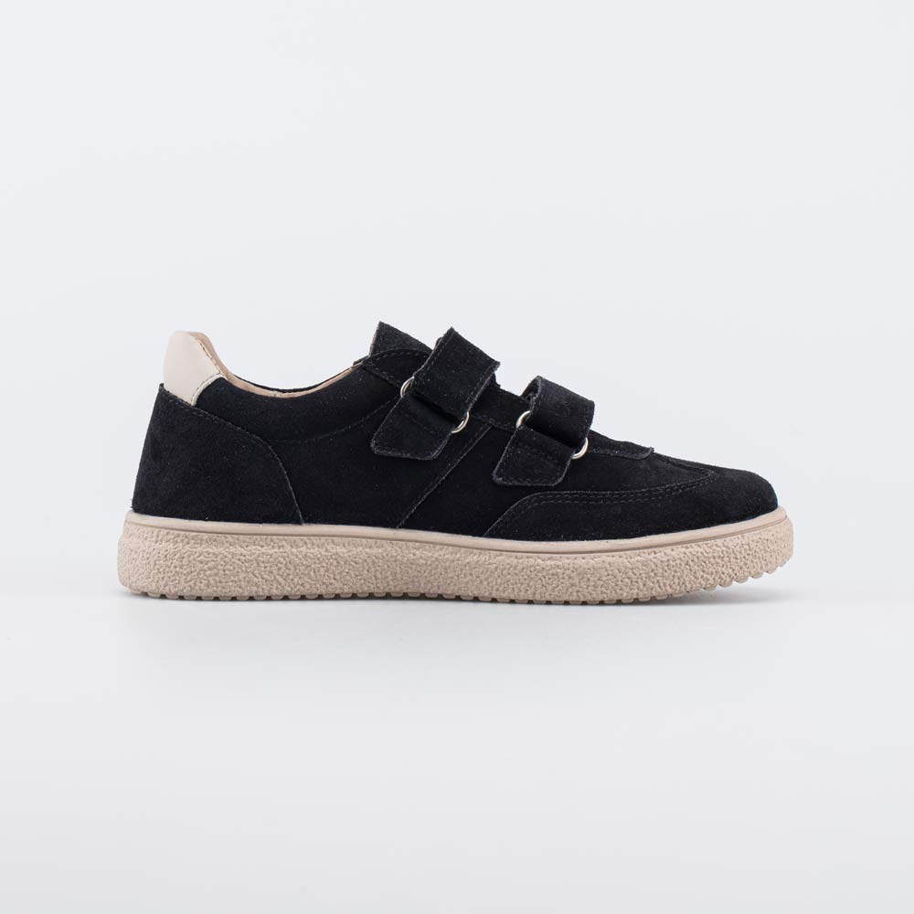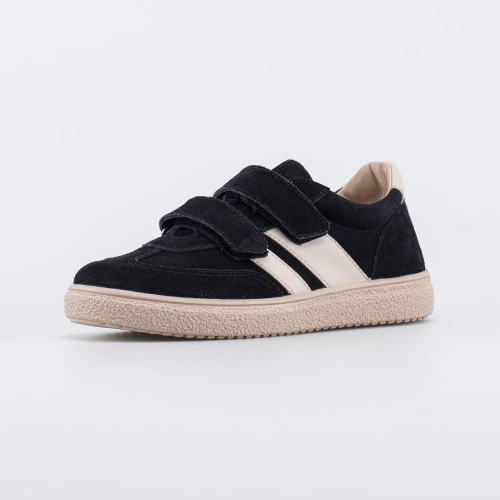 Детские велюровые полуботинки выполнены в сочетании контрастных цветов: черного и бежевого. Подходят для мальчика школьного возраста.