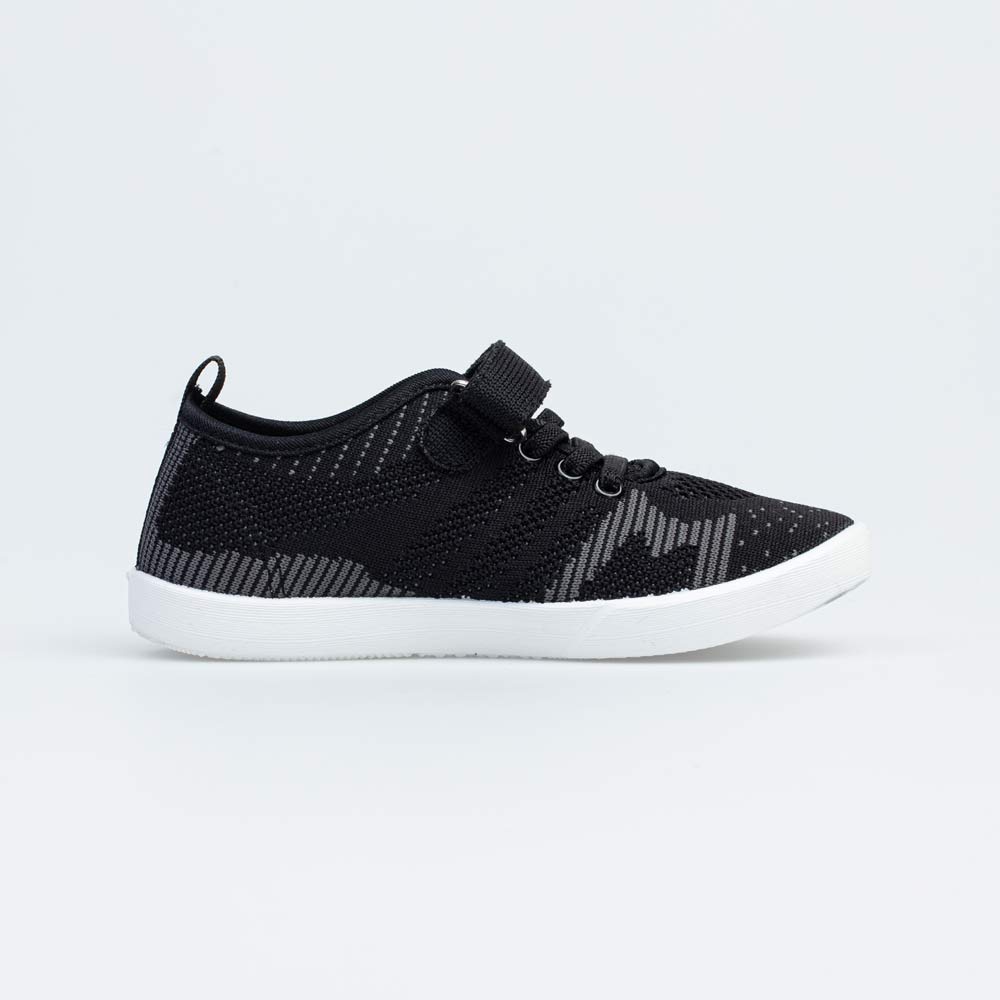 Черные кеды с белой подошвой имеют верх из вязаного текстиля, обладающего высокой воздухопроницаемостью. В такой детской обуви комфортно даже при длительной носке.