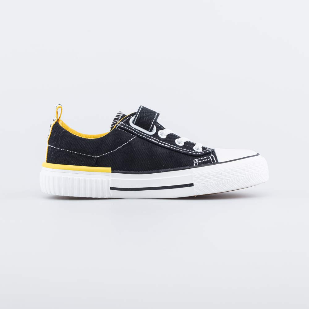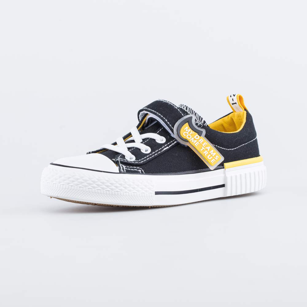 Текстильные кеды для мальчика выполнены в черном цвете с яркими акцентами желтого.