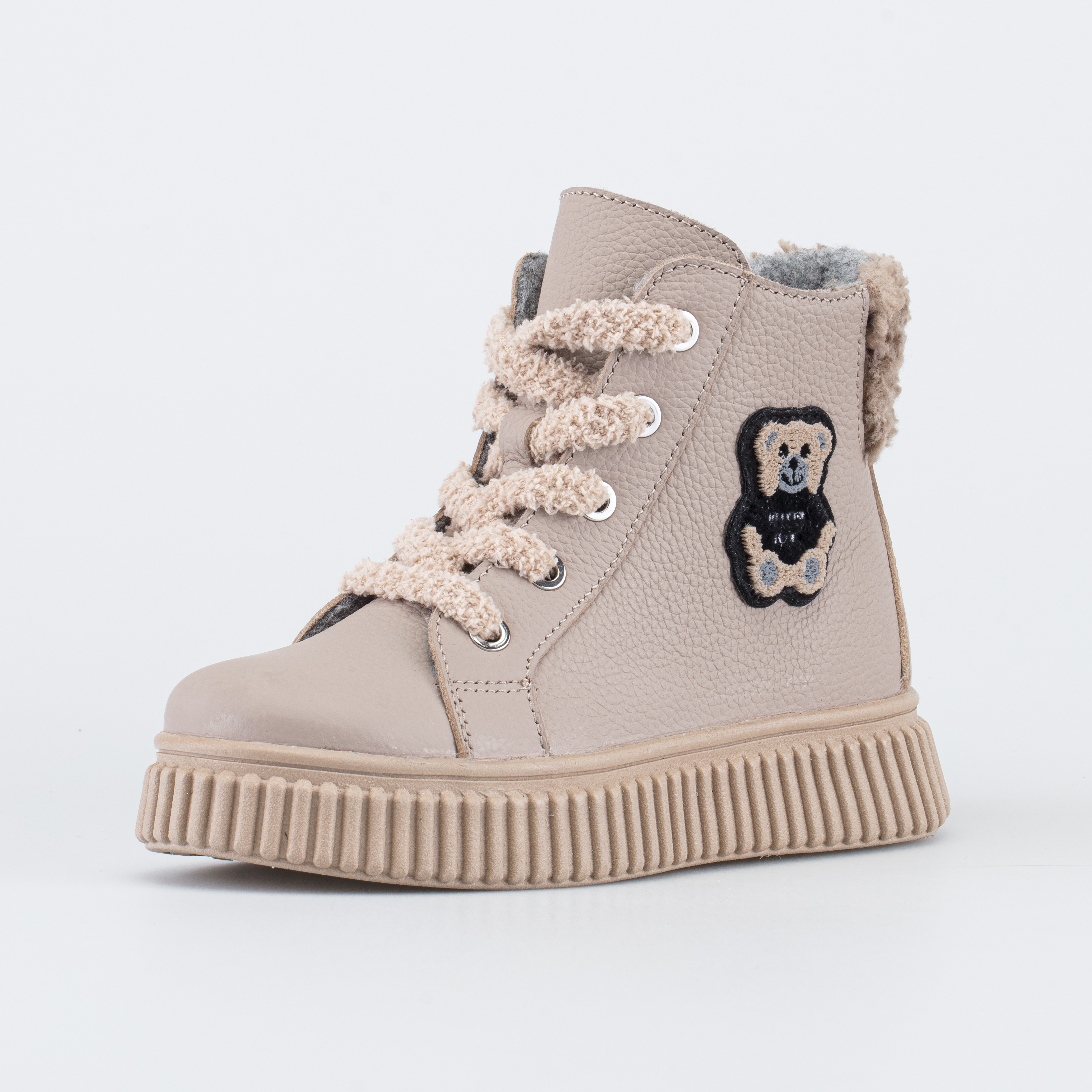 Верх этих бежевых ботинок изготовлен из гипоаллергенной и дышащей натуральной кожи разных фактур (гладкая кожа, велюр). Манжет украшен трендовым мехом под барашка. Тему тактильности продолжает махровая нашивка в виде медвежонка и махровые шнурки.