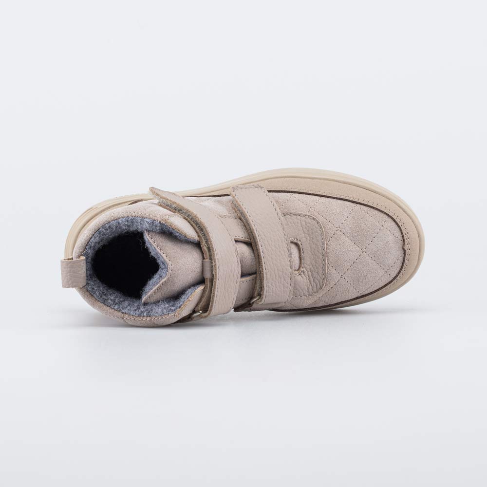 Верх детских ботинок изготовлен из натуральной кожи разных фактур (гладкая кожа, велюр) и украшен декоративной строчкой. По всему периметру вдоль подошвы модель защищена антивандальной накладкой.