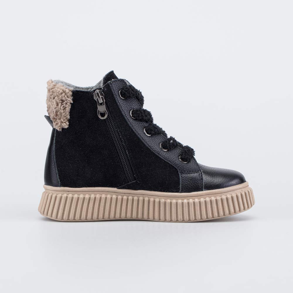 Верх этих черных ботинок изготовлен из гипоаллергенной и дышащей натуральной кожи разных фактур (гладкая кожа, велюр). Манжет украшен трендовым мехом под барашка. Тему тактильности продолжает махровая нашивка в виде медвежонка и махровые шнурки.