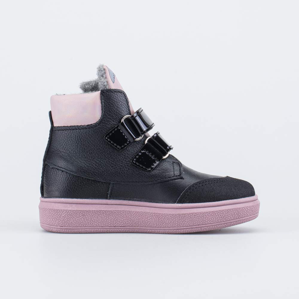 Утепленные кожаные ботинки черного цвета с принтом подходят для девочки, которая только начинает ходить.