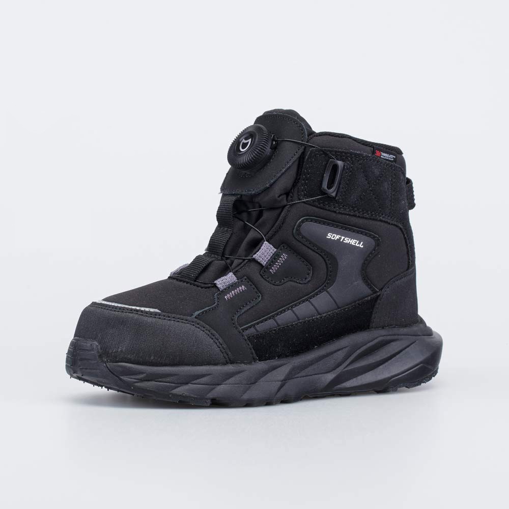 Верх черных ботинок изготовлен из материала Softshell, который не продувается ветром и отталкивает влагу. Ответственные детали выполнены из натуральной кожи. Носок и пятка защищены антивандальными накладками.
