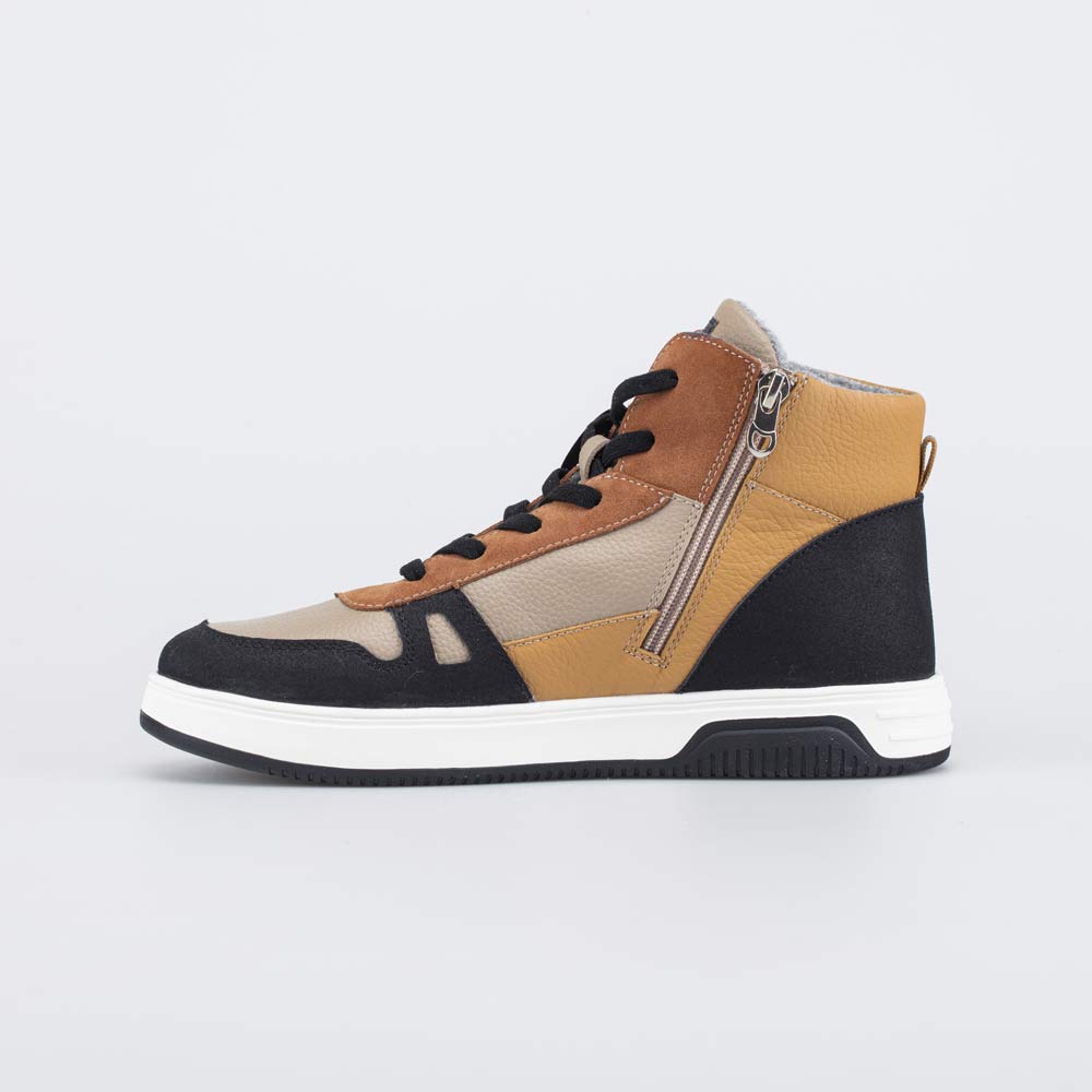 Верх выполнен из натуральной кожи в сочетании разных оттенков черного и бежевого. Носок и пятка защищены антивандальными накладками.