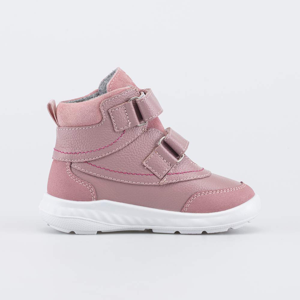 Верх детских ботинок изготовлен из гипоаллергенной и дышащей натуральной кожи розового цвета. Носочная и пяточная части ботинок защищены антивандальными накладками.