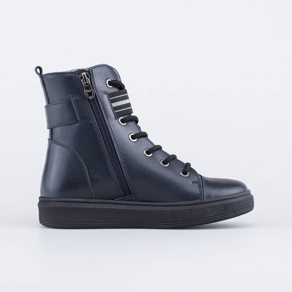 Верх выполнен из гладкой кожи синего цвета, что позволяет сочетать обувь со школьной формой.