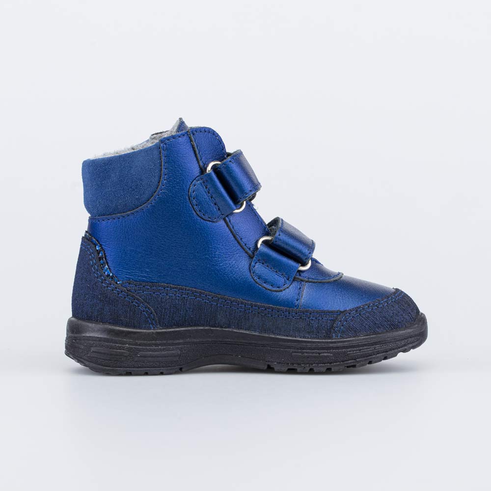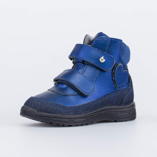 Детские ботинки имеют верх из натуральной кожи синего цвета. По всему периметру вдоль подошвы модель защищена от повреждений, влаги и реагентов антивандальной накладкой.