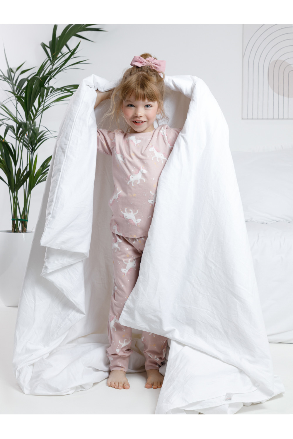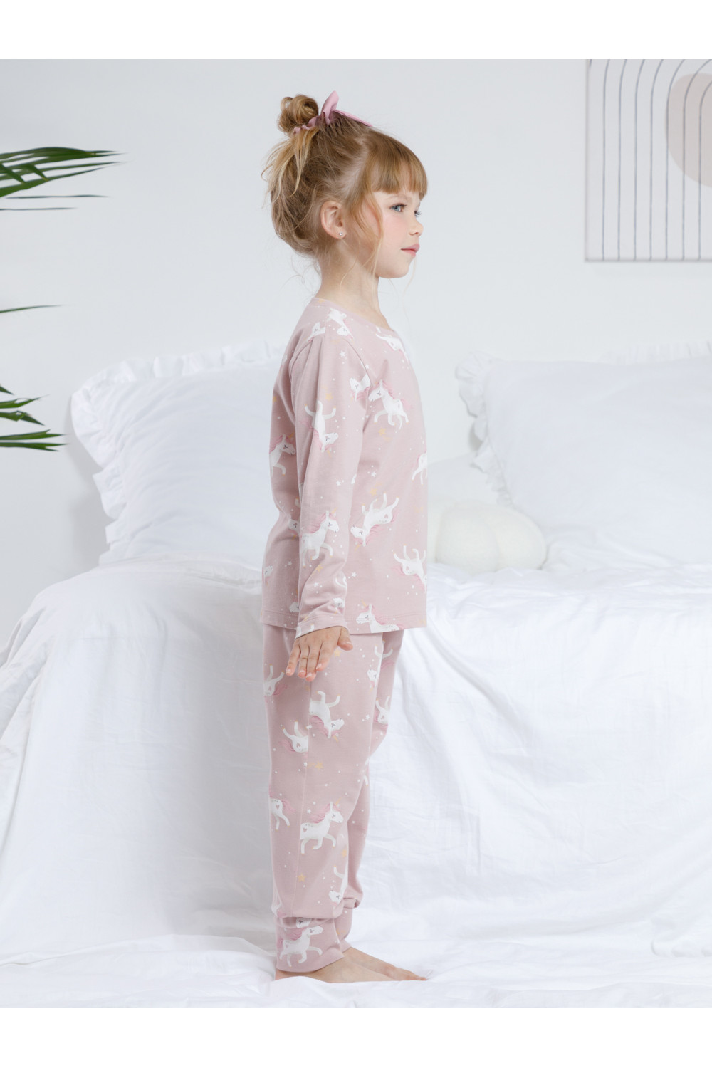 Пижама для девочки из натурального хлопка. Джемпер с длинными втачными рукавами и брюки с эластичной резинкой в поясе. Мягкие манжеты по низу брюк сделаны из материала в рубчик. Оригинальная набивка выполнена из стойких текстильных гипоаллергенных красителей. Изделие сохраняет цвет и форму после многократных стирок. Все трикотажные полотна производятся в соответствии с нормами швейцарского сертификата ЭкоТекс.