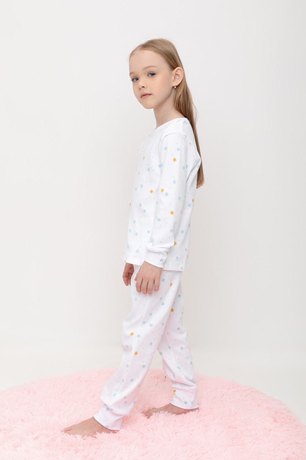 Трикотажный пижамный комплект из натурального хлопка. У джемпера длинные втачные рукава с мягкими манжетами. Брюки с удобным поясом на резинке и эластичными манжетами. Оригинальная набивка выполнена из стойких, гипоаллергенных текстильных красителей. Все трикотажные полотна производятся в соответствии с нормами Швейцарского сертификата ЭкоТекс.
