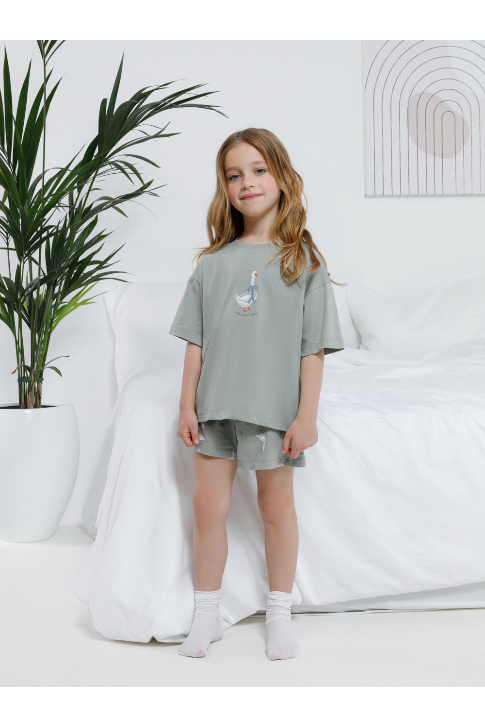 Трикотажная пижама из натурального хлопка для комфортного сна и отдыха. Футболка с короткими спущенными рукавами и шорты с мягкой эластичной резинкой в поясе. Оригинальная набивка и принт выполнены из стойких текстильных гипоаллергенных красителей. Изделие сохраняет цвет и форму после многократных стирок. Все трикотажные полотна производятся в соответствии с нормами швейцарского сертификата ЭкоТекс.