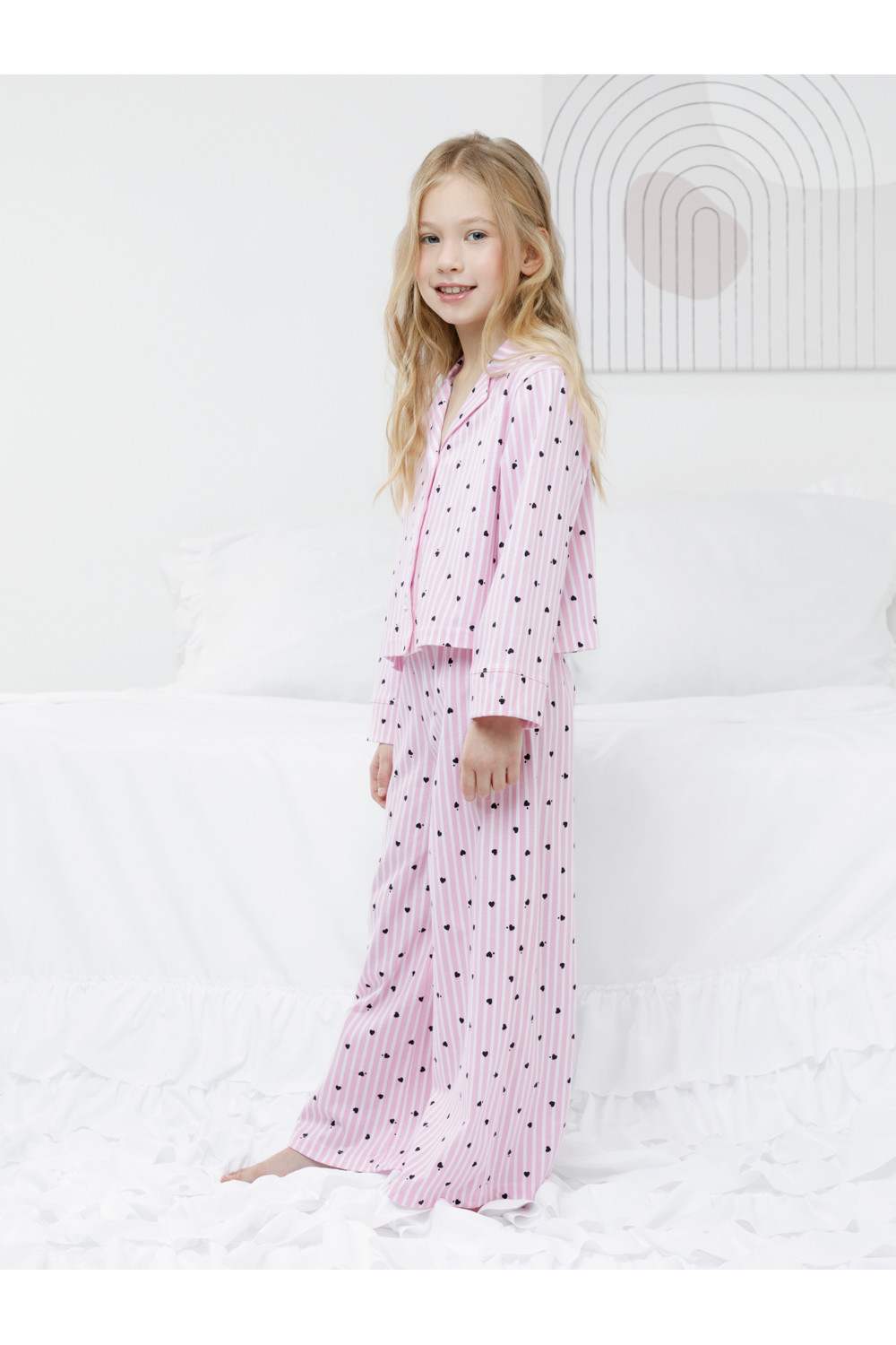 Трикотажная пижама из натурального хлопка для комфортного сна и отдыха. Рубашка на пуговицах с длинными рукавами и широкие брюки с мягкой эластичной резинкой в поясе. Набивной рисунок выполнен из стойких текстильных гипоаллергенных красителей. Изделие сохраняет цвет и форму после многократных стирок. Все трикотажные полотна производятся в соответствии с нормами швейцарского сертификата ЭкоТекс.