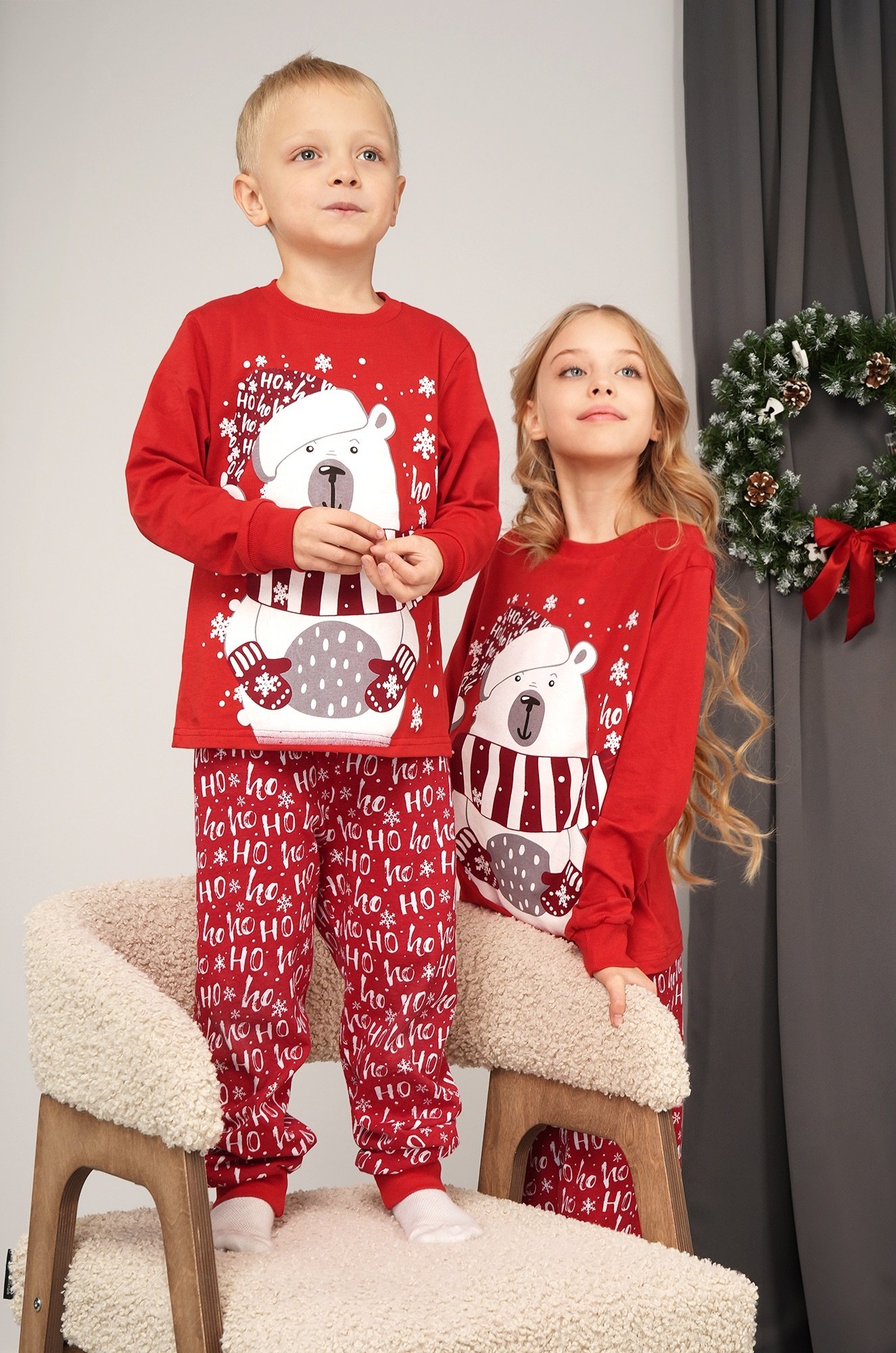 Пора заряжаться новогодним вайбом! Детская пижама с брюками выполнена из натурального 100% хлопка, который приятен к телу. Новогодняя пижама для детей и подростков имеет свободный крой, не сковывает движений и позволяет ребенку активно играть и двигаться. Яркий цвет и праздничный принт создают отличное настроение. Красная пижама для мальчиков и девочек станет прекрасным подарком на Новый год и Рождество.