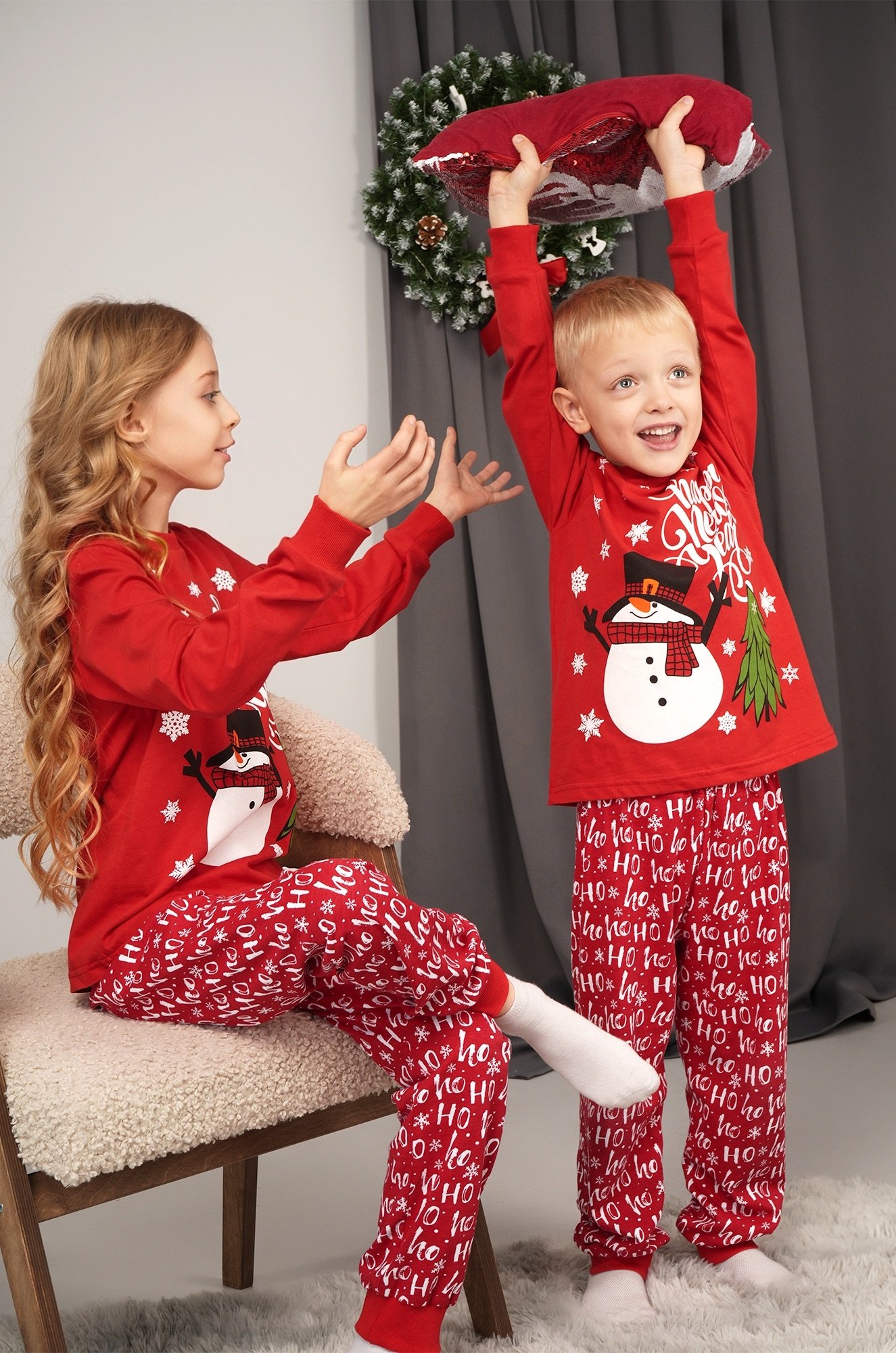 Яркая новогодняя пижама с брюками для мальчика и для девочки создаст атмосферу праздника и уюта. Весёлый принт Снеговик с надписью подарит радость и ожидание волшебства каждому ребенку. Детская пижама станет отличным подарком для детей и подростков на Новый год и Рождество.