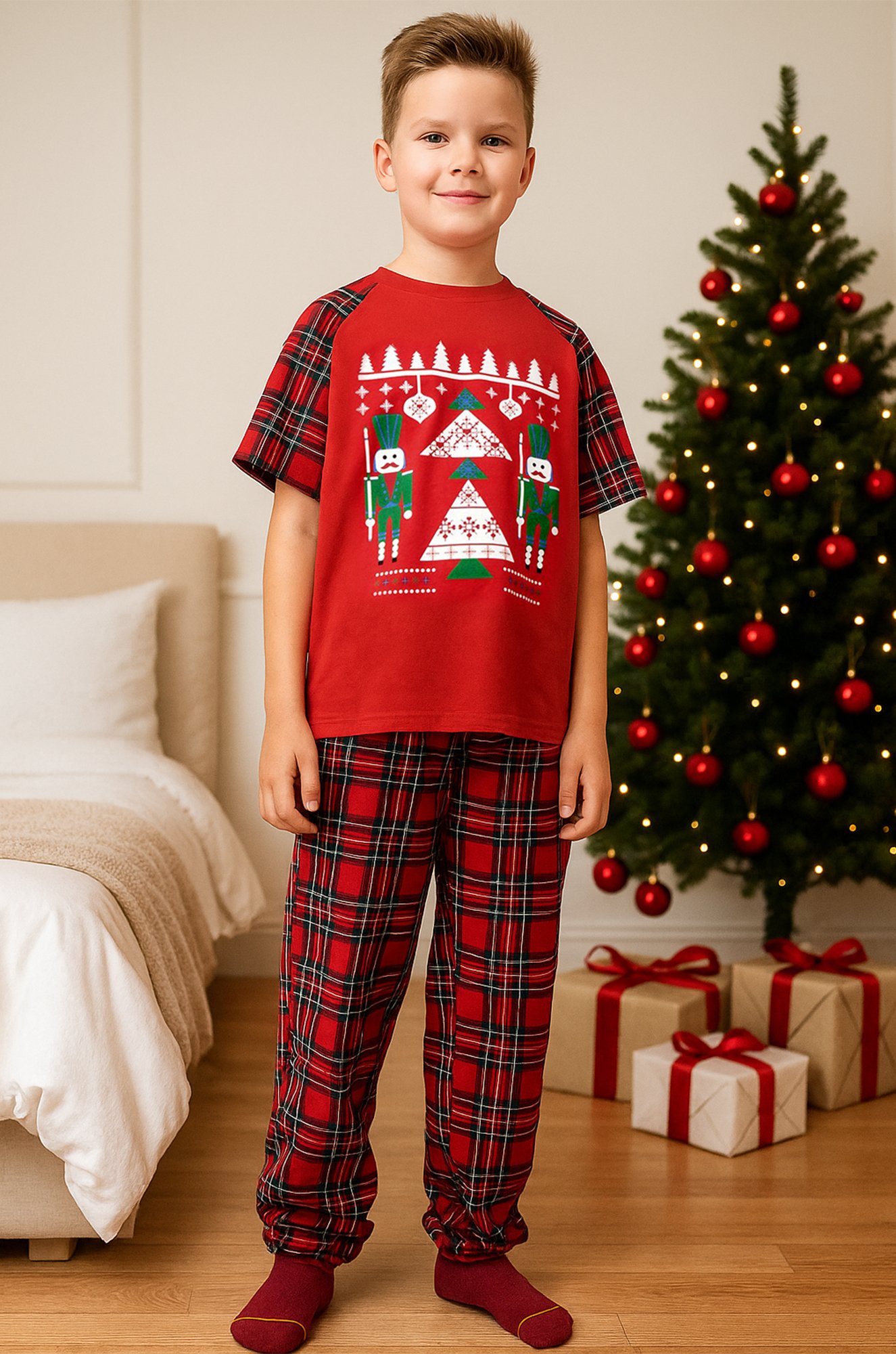 Новогодняя пижама для мальчиков и подростков выполнена из 100% хлопка. Красная футболка с праздничным принтом и брюки в клеточку с манжетами на штанинах делают домашний комплект удобным для сна, садика и семейных фотосессий.