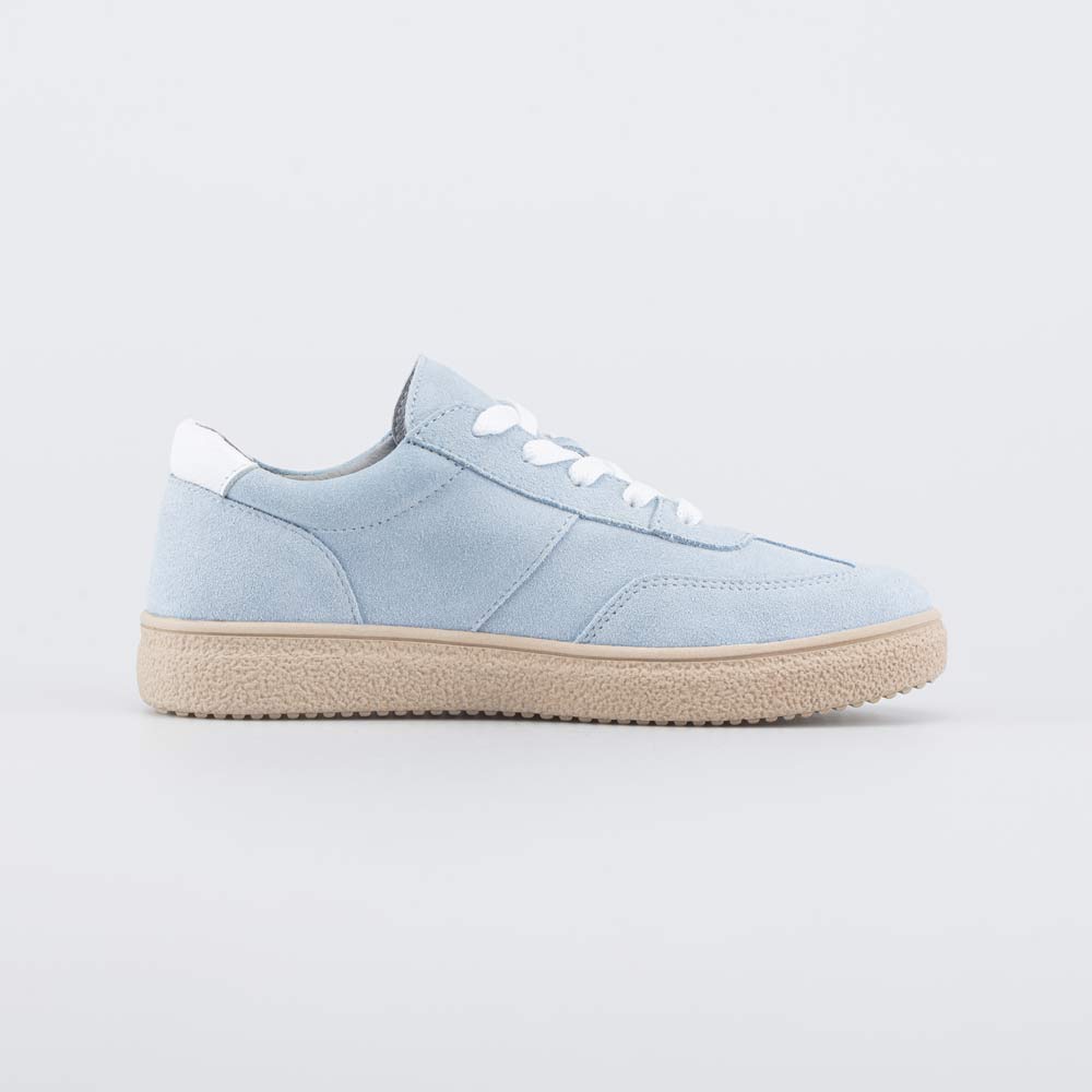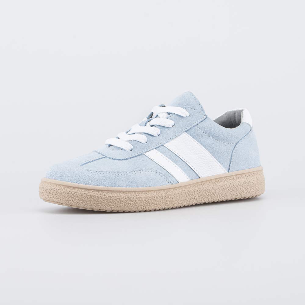 Верх изготовлен из дышащей натуральной кожи нежного голубого цвета, который дополнен белыми акцентами.