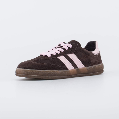 Верх этих демисезонных полуботинок для девочек изготовлен из дышащей натуральной кожи-велюра глубокого коричневого цвета, который дополнен нежно-розовыми акцентами.