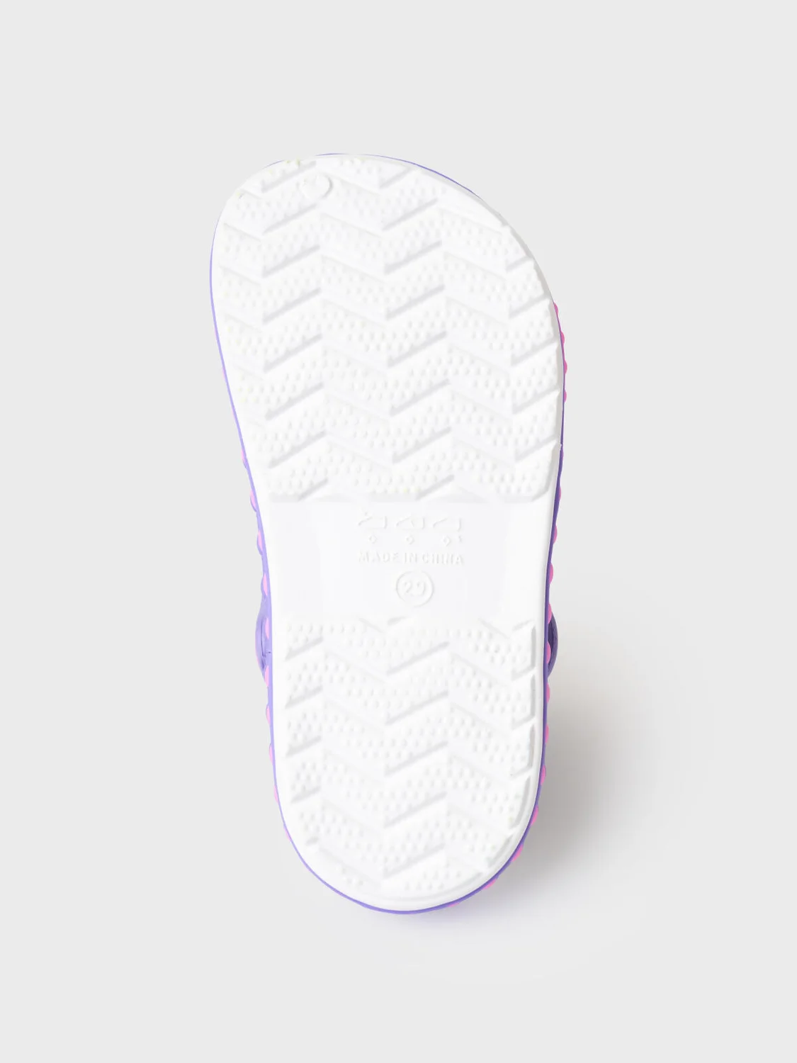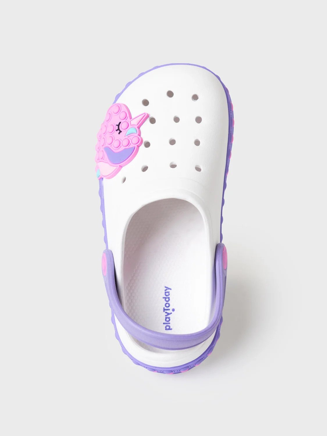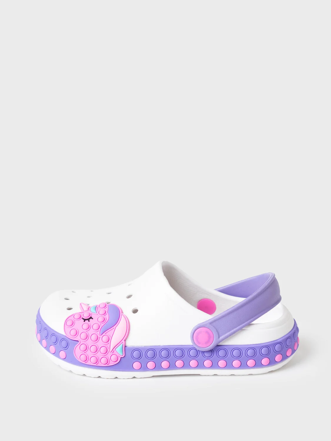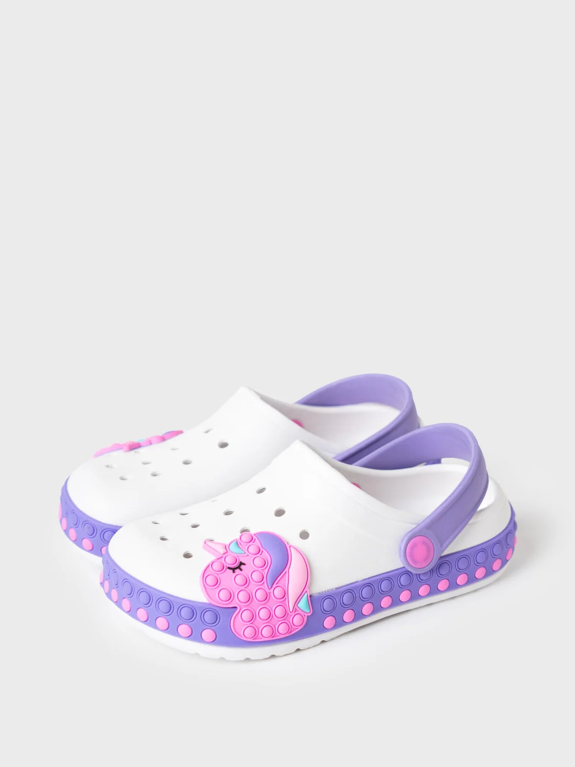 Сабо детские для девочки с единорогом. Сабо из облегченного и прочного ЭВА. Материал хорошо моется. Форма модели учитывает эргономику стопы. Модель имеет перекидной ремешок для лучшей фиксации обуви на ноге. Благодаря вентиляционным отверстиям сабо проветриваются, ноги ребенка дышат и не потеют.