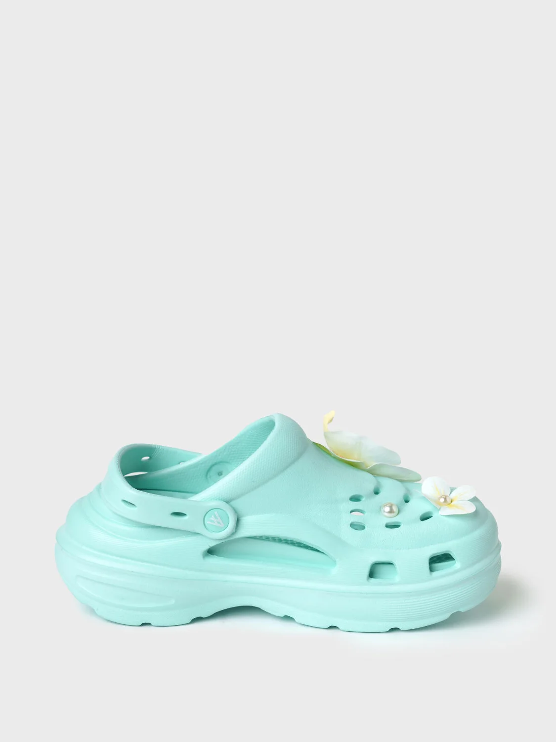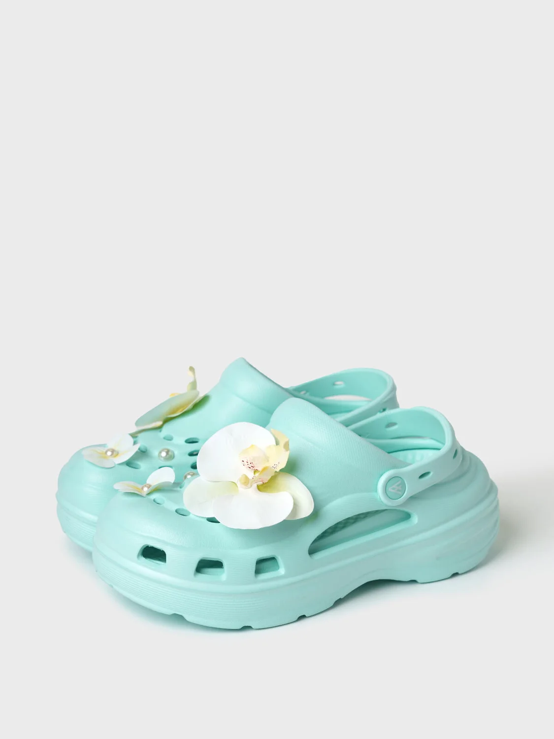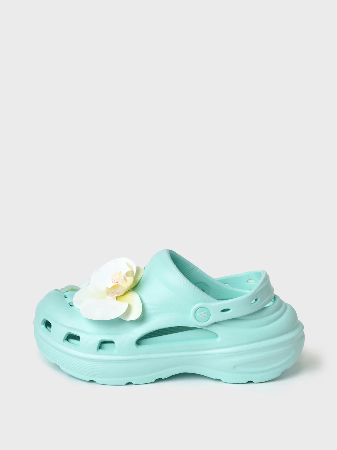 Сабо женские на высокой подошве. Модель выполнена из облегченного и прочного ЭВА. Материал хорошо моется. Форма модели учитывает эргономику стопы. Оригинальность модели придают большие съемные цветы-джибицы. Модель имеет перекидной ремешок фиксации ноги.