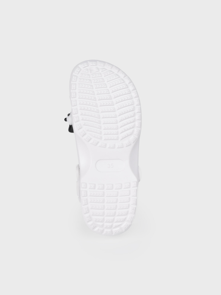 Трендовые сабо для девочки подростка в черно-белой гамме с джибицами-пандами. Шлепанцы выполнены из облегченного и прочного ЭВА. Материал хорошо моется. Форма модели учитывает эргономику стопы. Модель имеет перекидной ремешок для лучшей фиксации обуви на ноге.