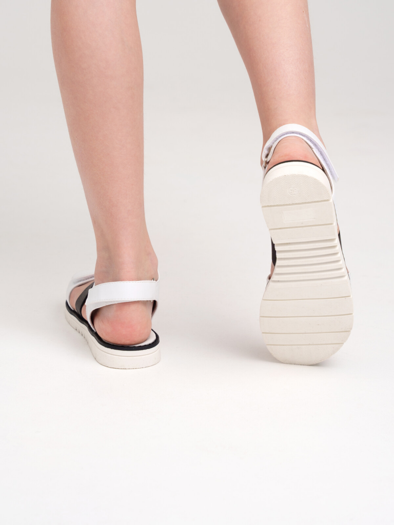 Сандалии из искусственной кожи. Облегченная подошва с противоскользящим протектором. Подкладка из натуральной кожи. Стелька из натуральной кожи с анатомическим элементом поддерживает свод стопы в правильном положении. Удобная застежка-липучка.