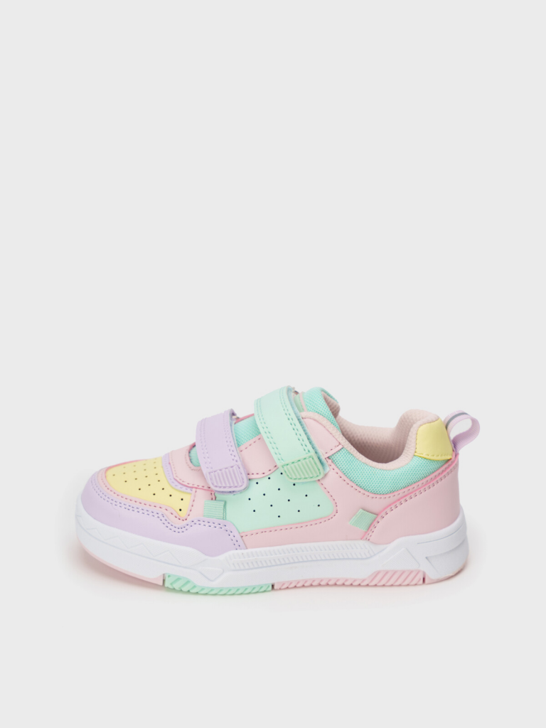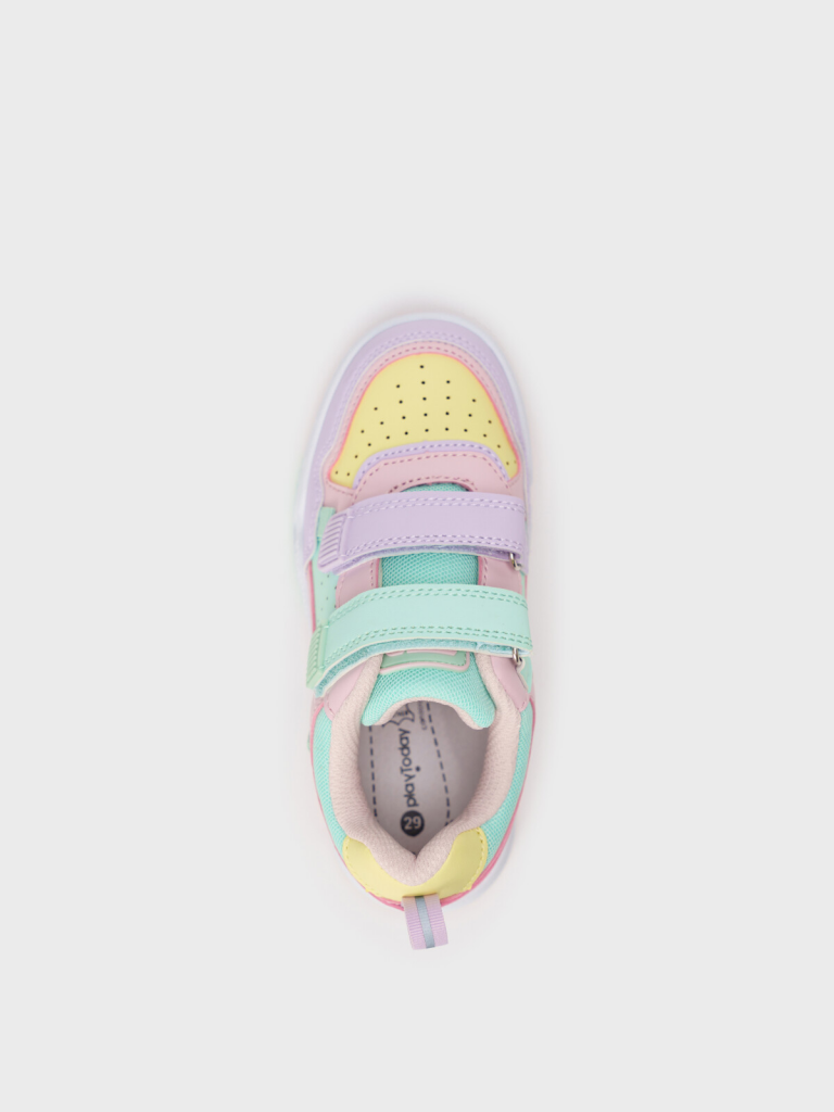 Трендовые детские кеды для девочки в стиле колор-блок. Кроссовки выполнены из искусственной кожи, обладающей высокими эксплуатационными свойствами, и текстиля в качестве отделки. Профилированная съемная стелька из свиной кожи с анатомической формой подсводника обеспечивает правильную нагрузку на стопу. В носочной части обуви стоит текстильная подкладка c высоким содержанием хлопка 80%, которая обладает высокой гигроскопичностью. В пяточной части обуви текстильная подкладка обладает хорошей износостойкостью. Две липучки создают удобство при обувании и надежно фиксируют ногу. Формоустойчивый задник поддерживает стопу в правильном положении. Эргономичная форма колодки обеспечивает правильное формирование стопы ребенка. Подошва из ТПР не скользит и устойчива к истиранию.