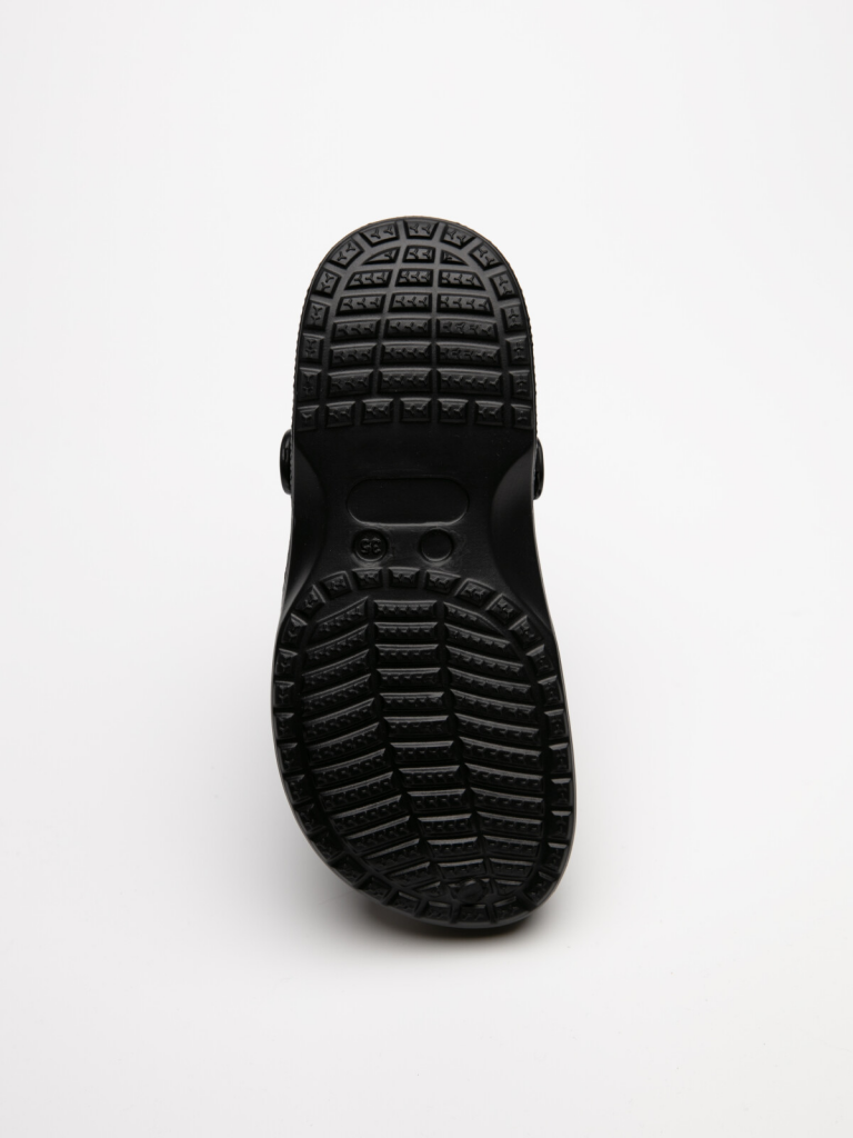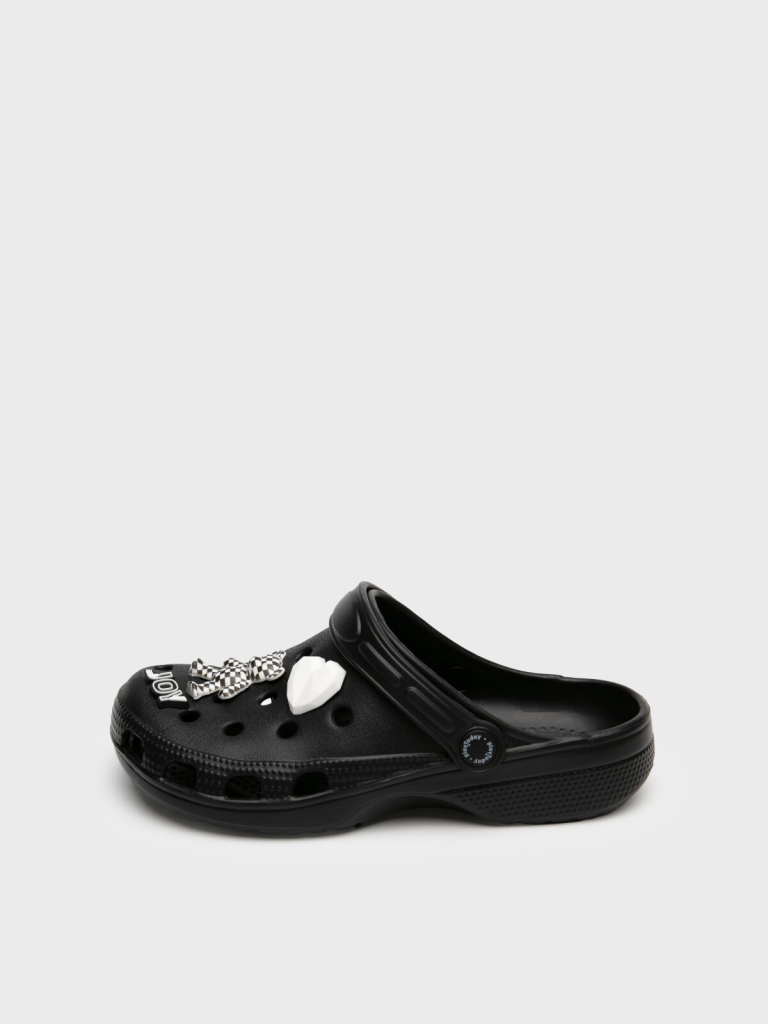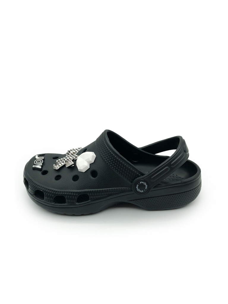 Трендовые сабо для девочки подростка в черно-белой гамме. Шлепанцы выполнены из облегченного и прочного ЭВА. Материал хорошо моется. Модель украшена фирменными джибицами. Форма модели учитывает эргономику стопы. Модель имеет перекидной ремешок для лучшей фиксации обуви на ноге.