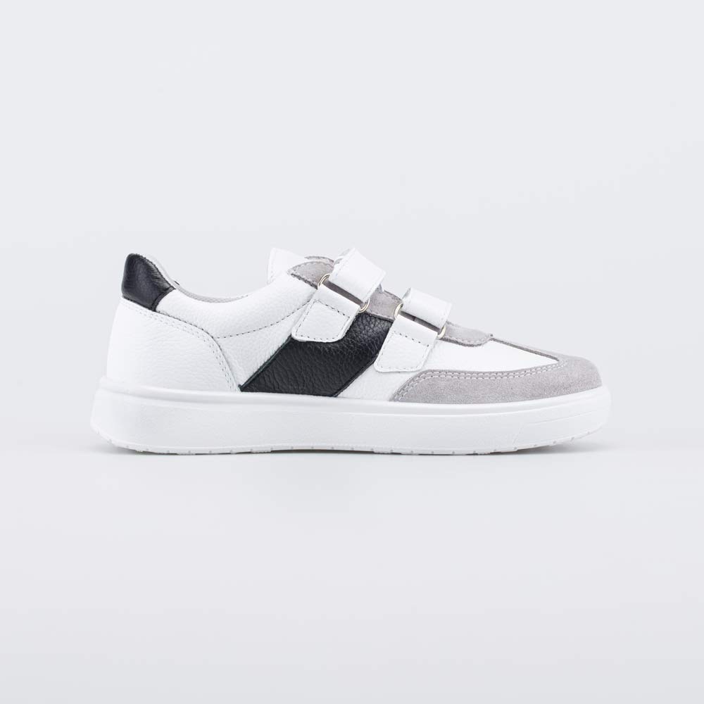Удобные кожаные полуботинки-кеды выполнены в сочетании трех цветов: серого, черного и белого. Подходят для мальчика школьного возраста.